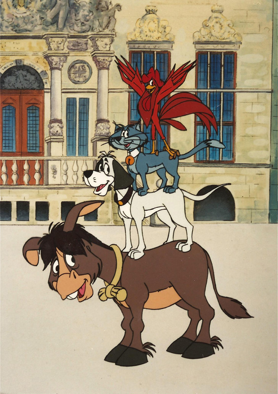 - RESUMEN DE LA HISTORIA: El cuento comienza con el abandono de un viejo asno, considerado por su dueño como inútil para su labor por la gran edad de este. Por lo tanto, el pobre animal huye en busca de su sueño de ser músico en la ciudad. En el camino encuentra otros animales que se encuentran en su misma situación como un gato, un perro y un gallo. Invita a todos ellos a formar parte de una banda musical y seguir su camino, todos aceptan al instante. Tras horas de caminata se topan con una casa y deciden asomarse, debido a que sobresale luz de la misma. Para sus sorpresa se encuentran a un grupo de ladrones que se están aprovechando de los víveres de este hogar y piensan un plan para instalarse ellos en su lugar. Por ello, se colocaron estratégicamente unos encima de otros y comenzaron a realizar diferentes ruidos para hacerlos creer que había fantasmas. Lograron así que los ladrones se marcharan y ellos se quedaron con esa humilde cabaña.